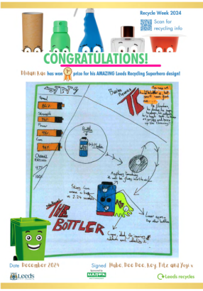 To mark Recycling Week in October, Leeds City Council launched the ‘Rescue Me – Recycle’ competition, in which pupils of primary age were asked to create a superhero made from recyclable material. The competition is designed to provide an engaging way of educating children and their families about the importance of recycling at home, ‘saving’ the recyclables from the general waste bin and is part of a city wide focus on increasing recycling rates.
